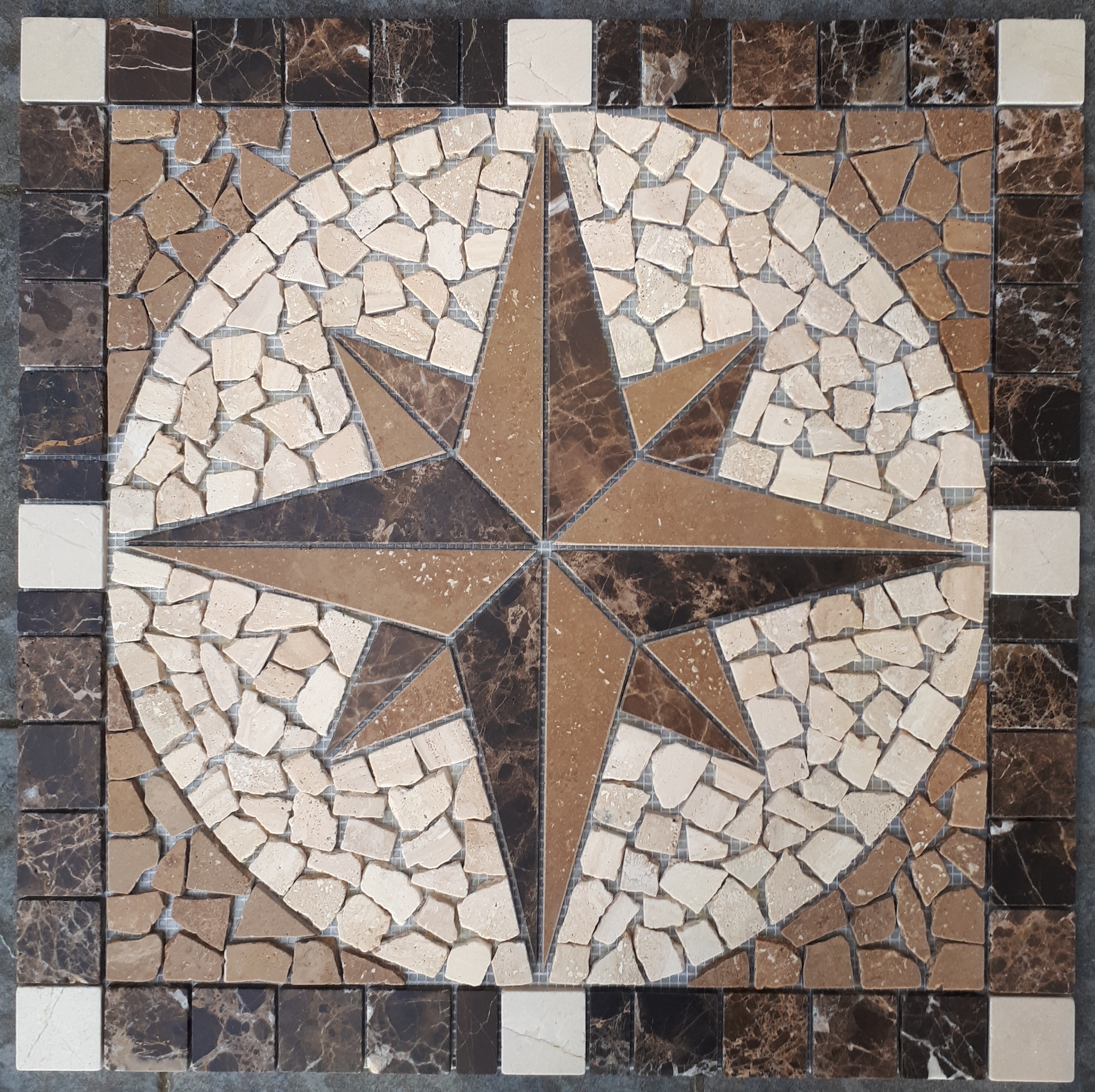 Wunderschöne Mosaik Rosone Windrose aus spanischem Emperador Dark, Crema Marfil und Travertin Marmor.